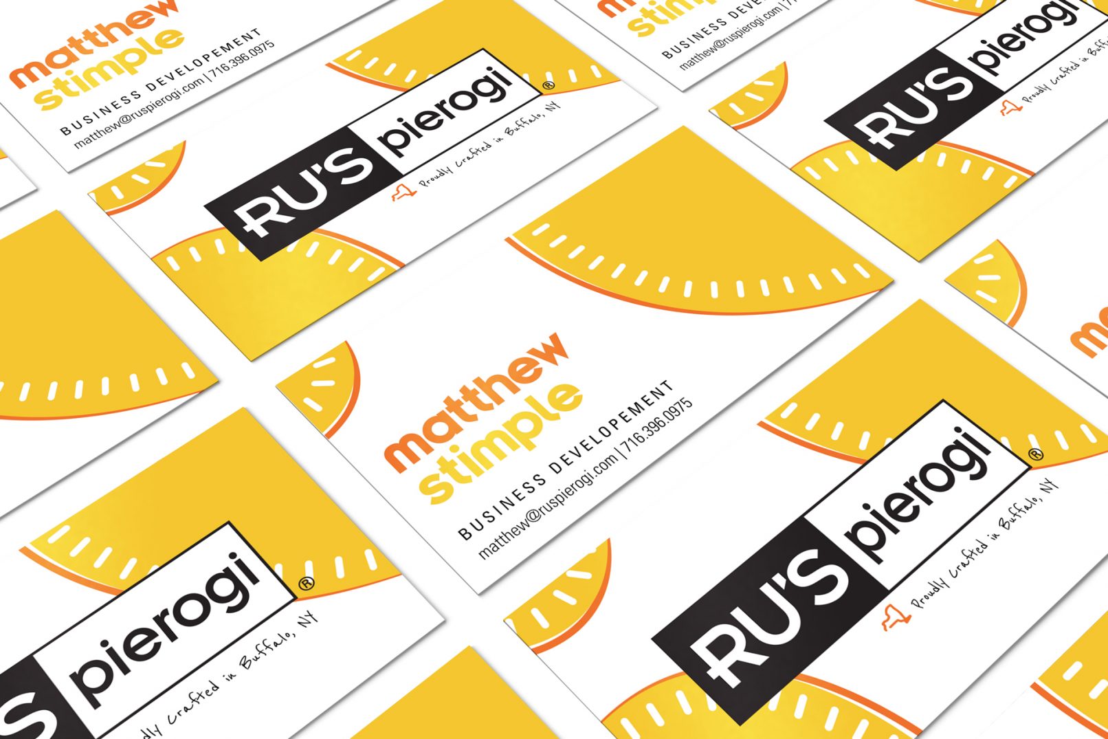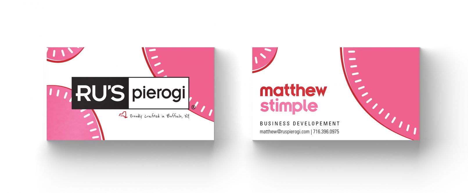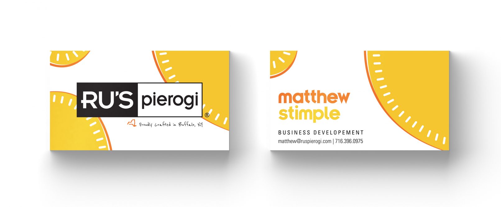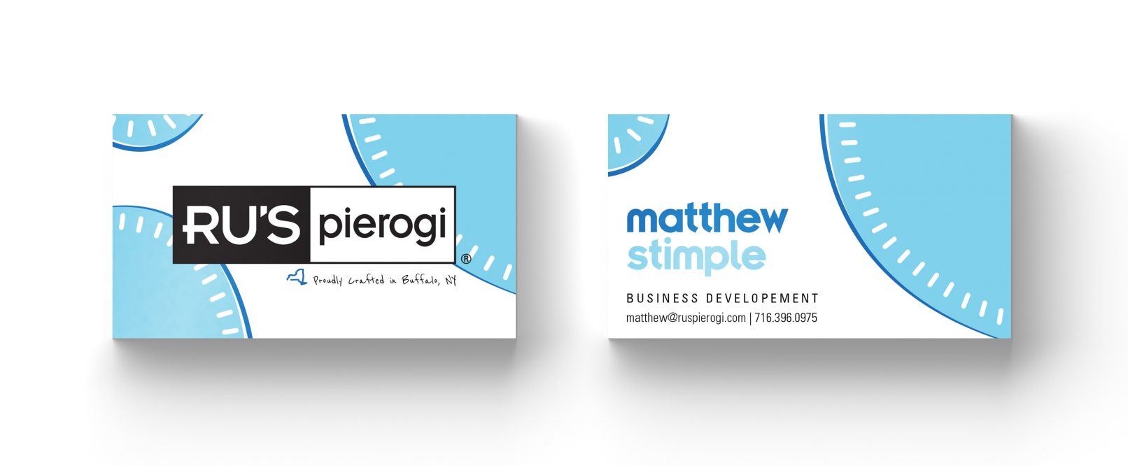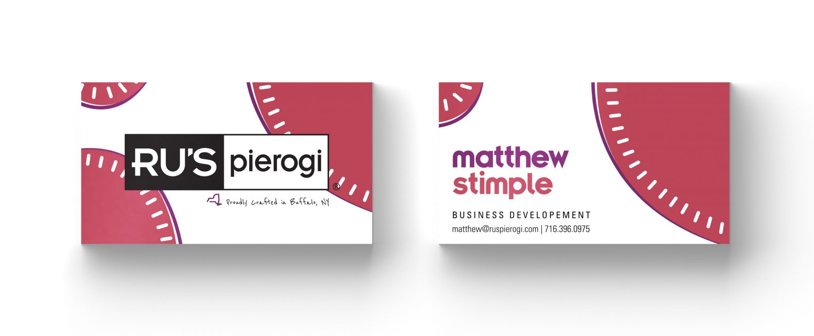 Business cards for Ru’s Pierogi, located in Buffalo, New York. These were created to expand upon the branding done by their agency of record, FIFTEEN. The shapes, colors, and line treatments were chosen to give a playful and unique twist on pierogi, while still staying true to the existing branding material. The alternate color choices pair with the different flavors that Ru’s Pierogi offer in their product line.