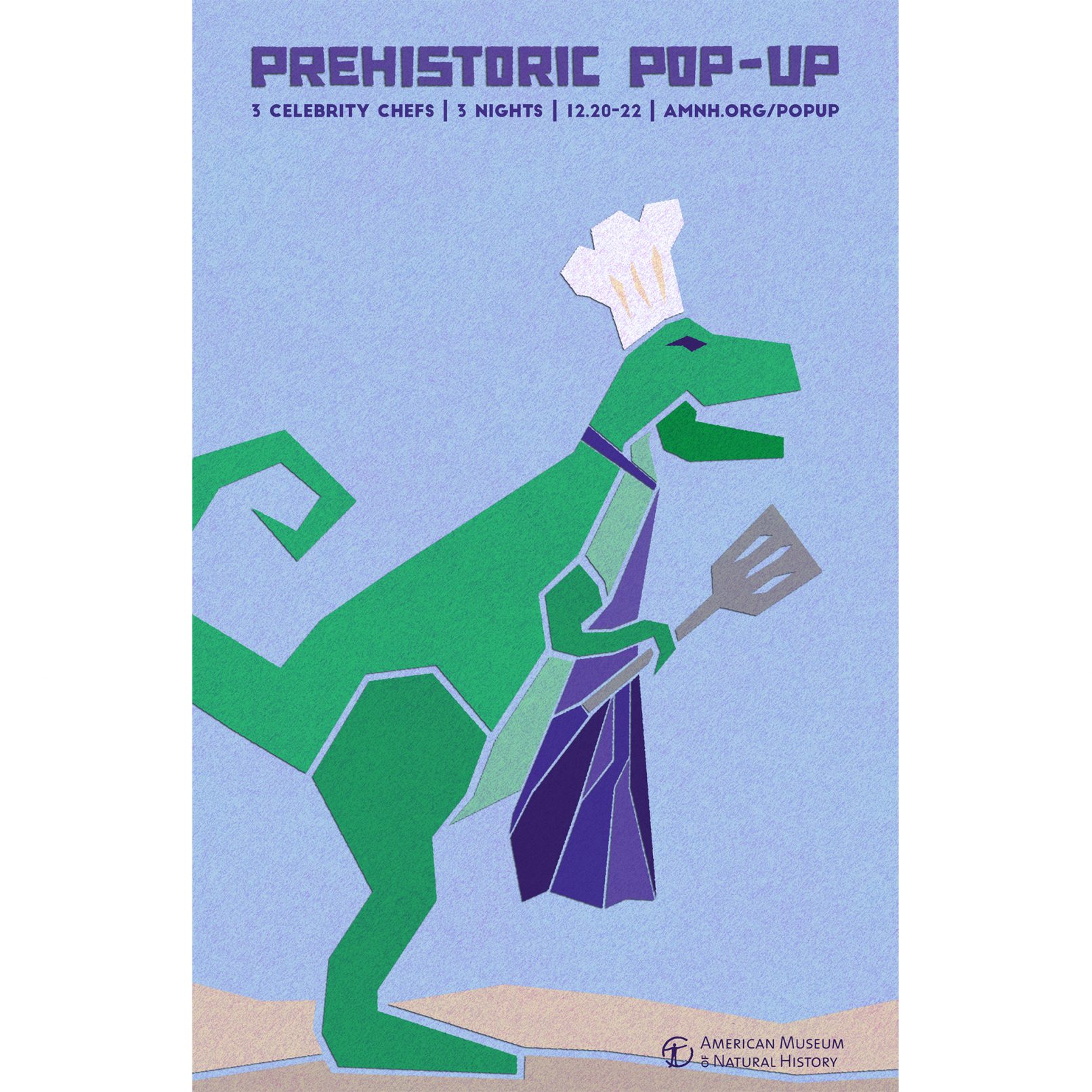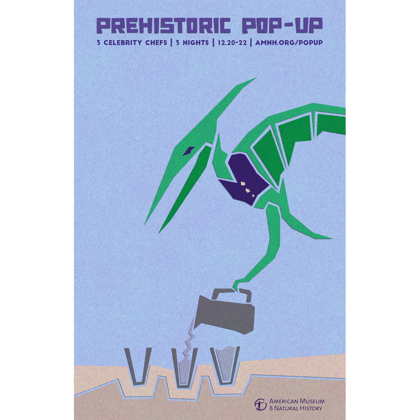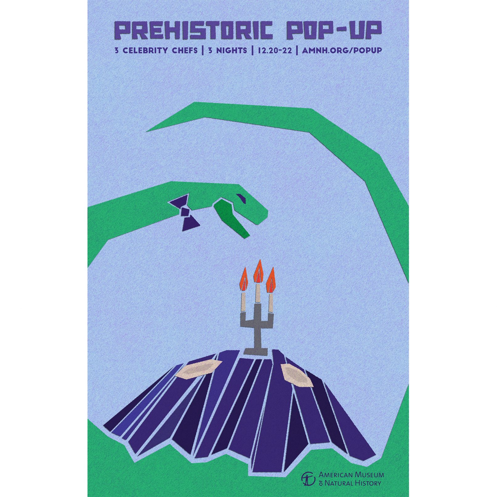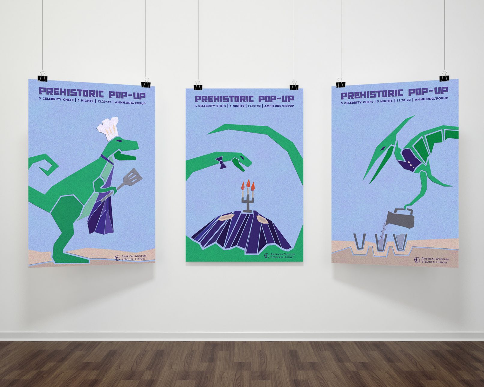 Poster series advertising a pop-up restaurant event taking place at the Museum of Natural History in New York. The series aims to drive visitors to the museum with three nights of unique culinary experiences, with menus curated by celebrity chefs. These pop-ups would integrate the surrounding prehistoric exhibits into the patron’s dining experience. The playful imagery of the dinosaurs, designed to emulate paper cutouts, paired with the sophisticated, light color palette ensure that any night of the event would be an evening to remember.